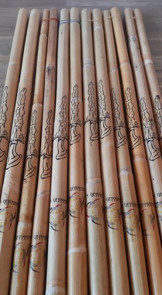 1 Paar (2 Stück) Rattanstöcke mit Aufdruck Logo FCS Germany und mit kleinem Kris-Schwert.